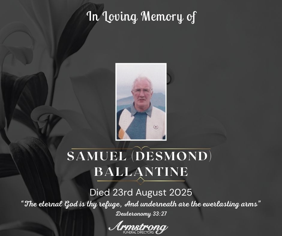 Service of Thanksgiving for the life of Desmond will be held in Clogherney Presbyterian Church on Tuesday at 2:00pm. A private family committal will take place.