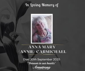 CARMICHAEL, (née YOUNG) ANNA MARY (ANNIE) Peacefully at South West Acute Hospital and late of 22 Edenfel Park, Hospital Road, Omagh. Dearly beloved wife of