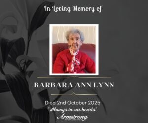 LYNN, (née THOMPSON) BARBARA ANN Suddenly yet peacefully at her daughter’s residence 12 Moneygal Road, Castlederg and late of 59 Festival Park, Omagh. Dearly beloved