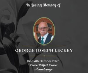 LECKEY, OCTOBER 4th, 2025 GEORGE JOSEPH Peacefully at Omagh Hospital and late of 30 Queens Parade, Hospital Road, Omagh. Dearly beloved husband of Iris, devoted