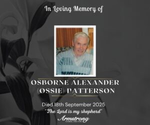 PATTERSON, OSBORNE ALEXANDER (OSSIE) Peacefully at South West Acute Hospital and late of 38 Derrynaseer Road, Dromore. Dearly beloved brother of Ruth and the late