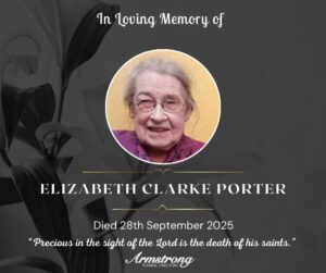 PORTER, ELIZABETH CLARKE Peacefully at Omagh Hospital and late of 29 Drumquin Road, Castlederg. Dearly beloved wife of James, devoted mother of Neville and Esther,