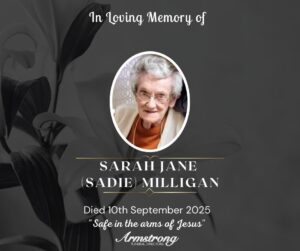 MILLIGAN, (née RANKIN) SARAH JANE (SADIE) Peacefully at her late home, 28 Main Street, Killen. Dearly beloved wife of the late Tommy. A devoted mother