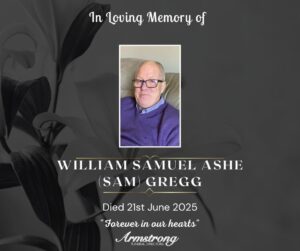 GREGG, WILLIAM SAMUEL ASHE (SAM) Peacefully at South West Acute Hospital and late of 28 Meadowvale Park, Omagh. Dearly beloved husband of Winifred, devoted father