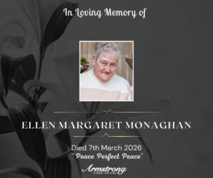 MONAGHAN, (née MURPHY) ELLEN MARGARET Suddenly at her late home 10 Barleyhill View, Ardstraw. Dearly beloved wife of the late Sammy, a devoted mother