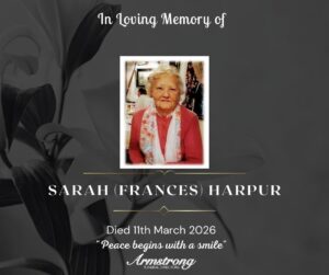 HARPUR, (née WATSON) SARAH (FRANCES) Peacefully at Altnagelvin Hospital and late of 13 Meadow Park, Sion Mills. Dearly beloved wife of the late Stewarty. A