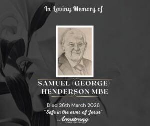 HENDERSON MBE SAMUEL (GEORGE) Suddenly at his late home, 12 Crevenagh Drive, Hospital Road, Omagh. Dearly beloved husband of Jean. A devoted father of David