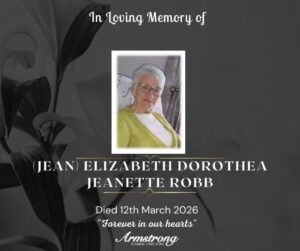 ROBB, (née SCOTT), (JEAN) ELIZABETH DOROTHEA JEANETTE Peacefully at Omagh Hospital and late of 1 Pinewood Close, Hospital Road, Omagh. Dearly beloved wife of the