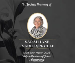 SPROULE, (née HAMILTON), SARAH JANE (SADIE) Surrounded by her loving family at Altnagelvin Hospital late of 42 Old Castle Road, Newtownstewart, formally of 24 Dunteigh
