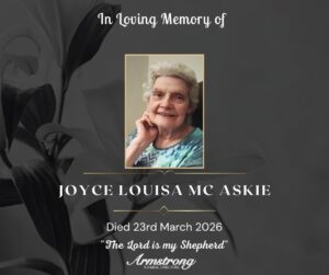 Mc ASKIE, (née GOULD), JOYCE LOUISA Suddenly at her late home 19 Lisnagirr Road, Mountjoy, Omagh. Dearly beloved wife of the late Robert, devoted mother