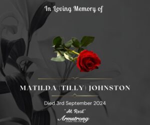 JOHNSTON, MATILDA (TILLY) Peacefully at Altnagelvin Hospital and late of 4 Castlemurray, Strabane. Dearly beloved daughter of the late Rebecca, devoted mother of David (Moyna)