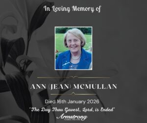 McMULLAN, ANN JEAN Peacefully at Parkview Nursing Home, surrounded by her family. Dearly beloved wife of the late Samuel, mother of Trevor (Diane) and Fiona