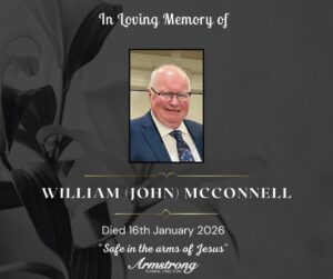 McCONNELL, WILLIAM (JOHN) Suddenly at Omagh Hospital and late of 17 Knockgreenan Avenue, Omagh. Dearly beloved husband of Valerie, devoted father of Sarah (Keith) and
