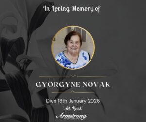 NOVAK, GYÖRGYNE Peacefully at 2 Arleston Park, Omagh. Beloved mother of Szilvia and Zsuzsanna, grandmother of Karmen and Eszter, great-grandmother of Noemi, Levente and Kondrad.