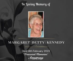 KENNEDY, (Nèe McLoughlin), MARGARET (BETTY) Peacefully at Pond Park Care Home and late of Innisfayle Park, Lisburn. Dearly beloved wife of the