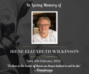 WILKINSON, (Nèe BURNETT), IRENE ELIZABETH Peacefully at Altnagelvin Hospital and late of 14 Edenfel Park, Hospital Road, Omagh. Dear beloved wife of the late Cecil,