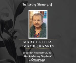 RANKIN, (nèe Kerrigan) MARY LETITIA (MAMIE) Suddenly at Altnagelvin Hospital and late of 22 Backhill Road, Clare, Castlederg. Dearly beloved wife of Andy, devoted mother