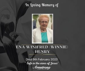 HENRY, (Nèe Lewis) ENA WINIFRED (WINNIE) Peacefully surrounded by her loving family at Altnagelvin Hospital and late of 59 Thornlea, Hospital Road, Omagh.