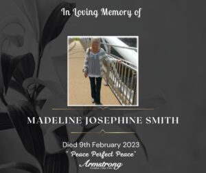 SMITH, MADELINE JOSEPHINE.. Peacefully at South West Acute Hospital and late of 5 Winters Gardens, Omagh. A devoted mother of Brian & Drew, a much-loved