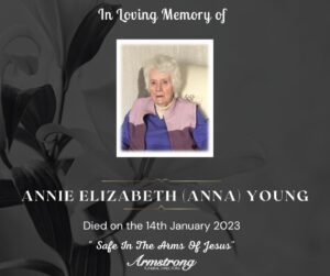 YOUNG (Nèe Moore), ANNIE ELIZABETH (ANNA) Peacefully at South West Acute Hospital and late of 34 Carnkenny Road, Ardstraw, Newtownstewart. Dear beloved wife of the