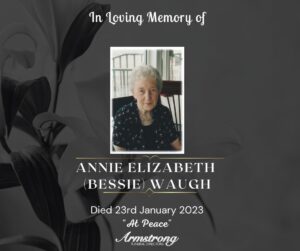 WAUGH, (Nèe Connolly), ANNIE ELIZABETH (BESSIE) Peacefully at Parkview Nursing Home, Castlederg. Dear beloved wife of the late William, a devoted mother