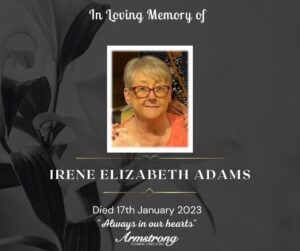 ADAMS (Nèe Murphy), IRENE ELIZABETH Peacefully at Altnagelvin Hospital and late of 1 Park Terrace, Sion Mills. Dear beloved wife of George,