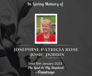 DOBBIN (Nèe Mulholland), JOSEPHINE PATRICIA ROSE (JOSIE) Peacefully at her late home, 7 Golan Villas, Omagh. Dear beloved wife of the late