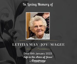MAGEE (Nèe Loughlin) LETITIA MAY (JOY) Peacefully at her late home Hillhouse, 12 Brocklis Road, Ardstraw Dear beloved wife of the late