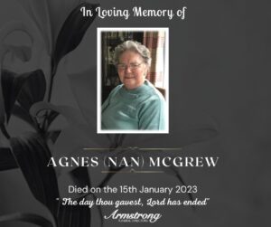 McGREW (Nèe Good), AGNES (NAN) Peacefully at Knockmoyle Lodge, Nursing Home and late of 45 Thornlea, Hospital Road, Omagh. Dear loved wife