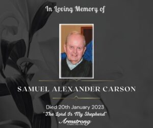 CARSON, SAMUEL ALEXANDER Peacefully at South West Acute Hospital and late of 14 Castle Place, Omagh. Dearly beloved husband of Ruth, dear