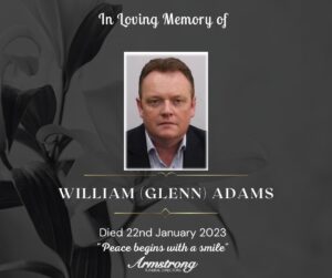 ADAMS, William (Glenn) Peacefully at Stoke Mandeville Hospital, surrounded by his loving family and late of Saunderton, Buckinghamshire (formally Omagh). Beloved husband