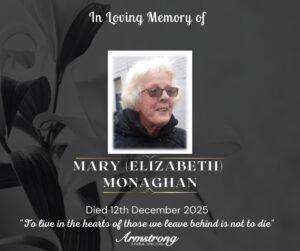 MONAGHAN, (née WALSH) MARY (ELIZABETH) Peacefully at Altnagelvin Hospital and late of 26 Drumclamph Road, Castlederg. A devoted mother of Ivan (Johanne), Harold (Ann) and