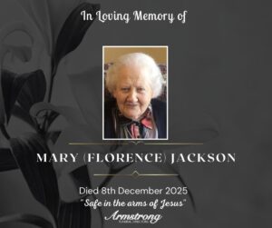 JACKSON, (née SMYTH), MARY (FLORENCE) Peacefully at South West Acute Hospital and late of 80 Bridge Road, Dromore. Dearly beloved wife of the late Arnold