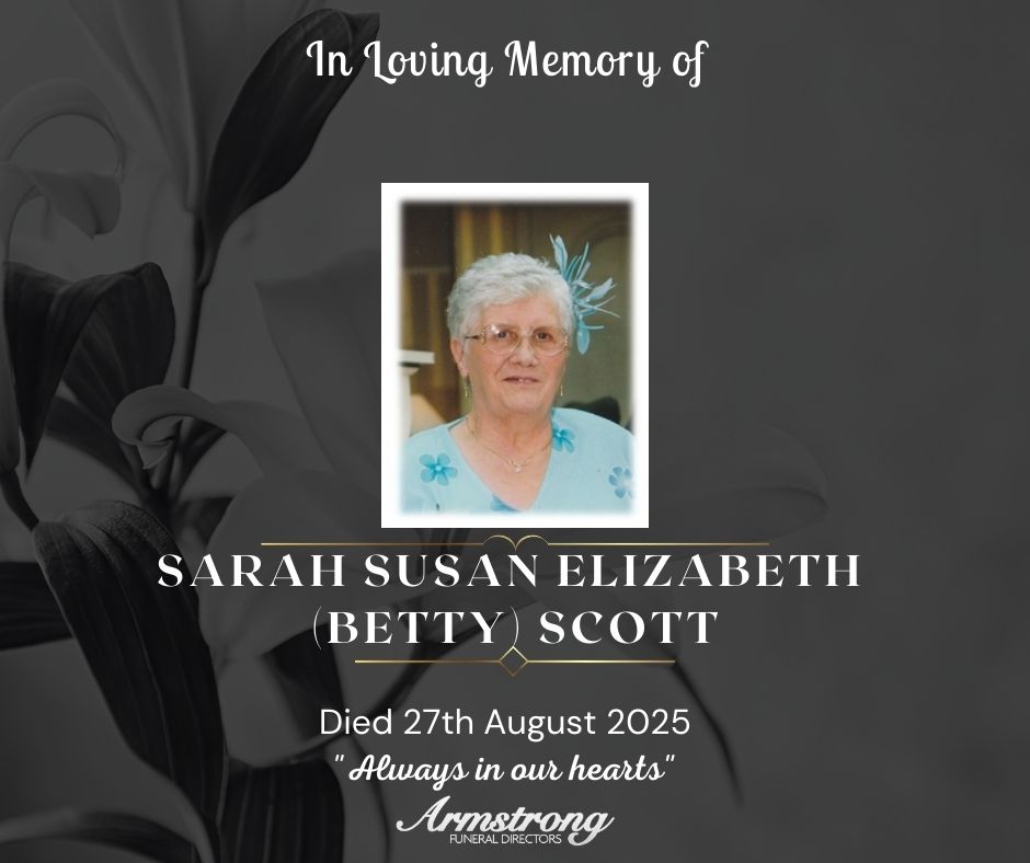 Service of Thanksgiving for the life of Betty will be held in her late home on Sunday at 2:00pm followed by committal in Castlederg New Cemetery.