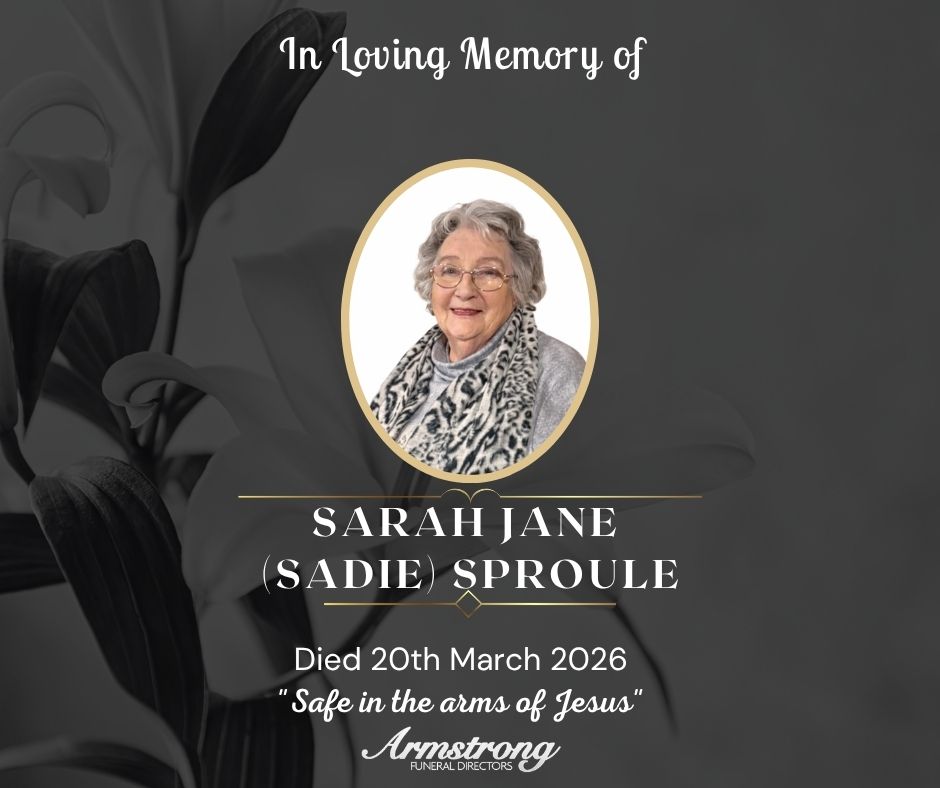Service of Thanksgiving for the life of Sadie will be held in Lislimnaghan Parish Church on Monday at 1.00pm followed by committal in Ardstraw Parish Church Graveyard, Newtownstewart.
